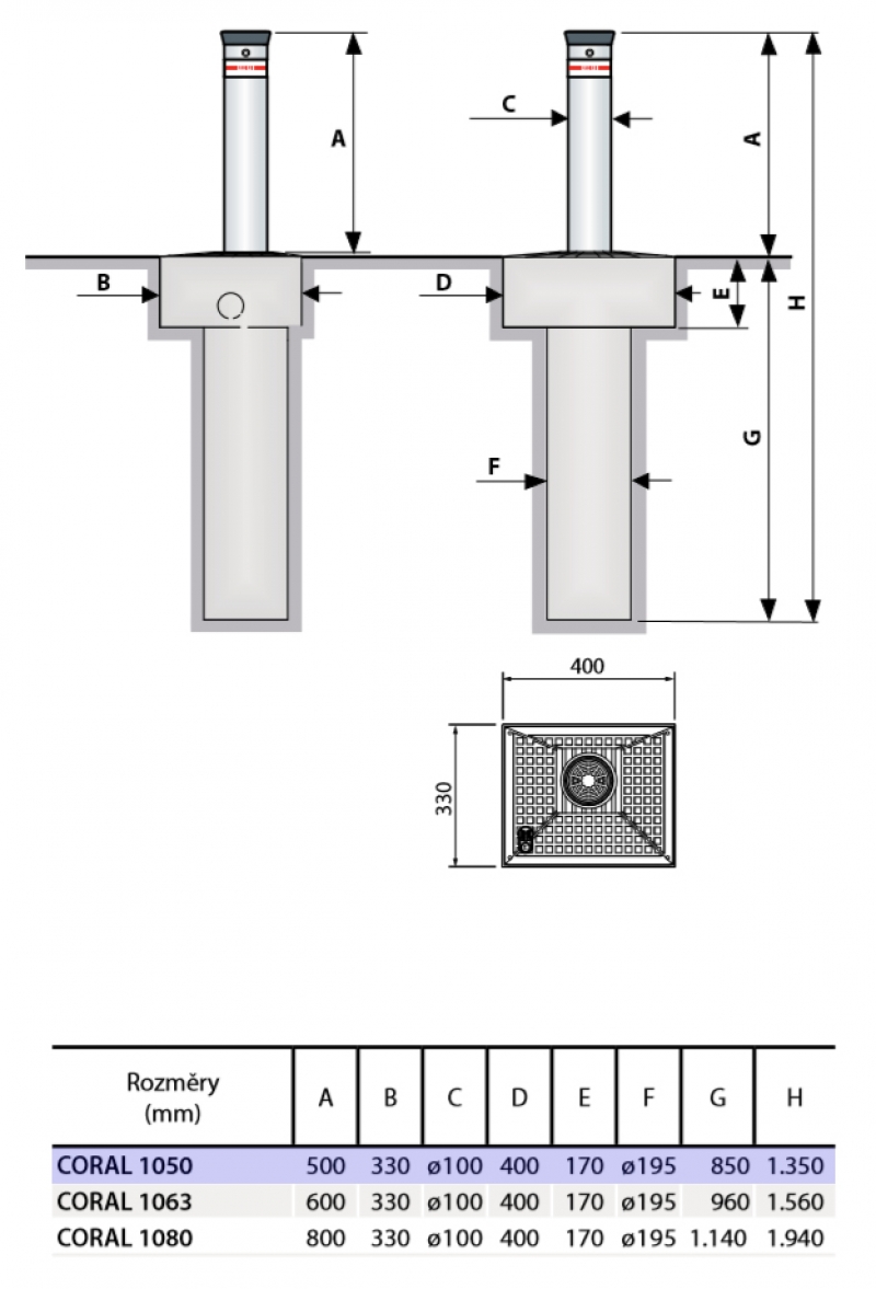 POZNÁMKA: zásuvný sloup ovládaný hydraulickým pohonem s integrovanou hydraulickou jednotkou. Napájecí napětí 230 V, 10 m el. kabelů. Sériové vybavení magnetickými koncovými spínači. Ocelový sloup S235J lakovaný kataforézou a polyesterovým práškovým lakem. Homologovaná reflexní samolepka. V příslušenství dodáván speciální klíč pro manuální zasunutí sloupu. Příslušenství ke všem modelům již obsahuje pouzdro k zabetonování z žárově pozinkované oceli. Kryt pohonu hydraulické jednotky je galvanicky pozinkován.