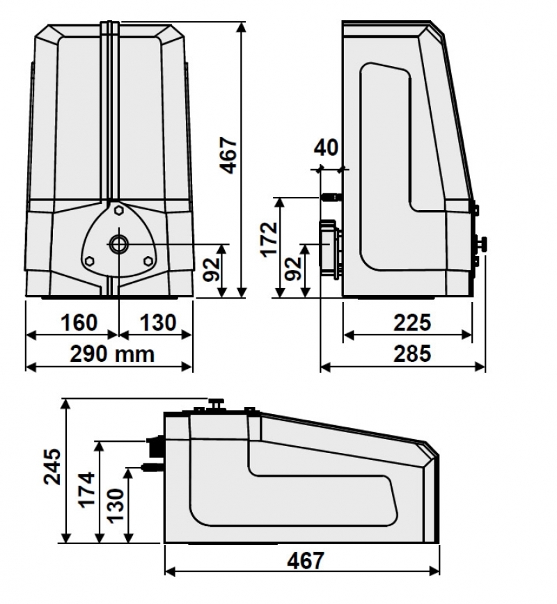 kompletní modelová řada. Horizontální a vertikální verze. Vhodný pro intenzivní a průmyslové použití. Elektronická řídicí jednotka může být uložena uvnitř pohonu MEC 200 nebo může mít vlastní polykarbonátový kryt pro vnější instalaci.