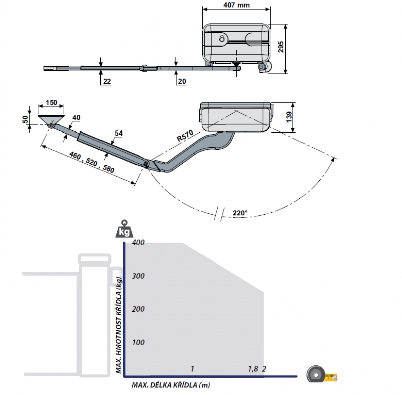 kloubové rameno z tlakově litého hliníku v provedení odolném proti střihu, lakované kataforézou, s přístupem k manuálnímu odblokování pomocí bezpečnostního klíče – není součástí dodávky.