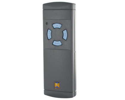 Ruční vysílač Hörmann HS 4-868 v tmavě šedém standardním pouzdře se čtyřmi kruhově modrými tlačítky. Ruční vysílač HS4-868 má vždy frekvenci 868,3 MHz. S ručním vysílačem můžete ovládat garážová vrata z auta za tmy nebo špatného počasí.