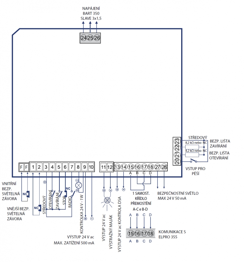 Elektronická řídicí jednotka pro pohon BART 350 Master: ovládání zdvihu s automatickým načítáním, zpomalení, reverzace směru chodu při nárazu na překážku, připojení k řídicí jednotce ELPRO 35S, deska slave.