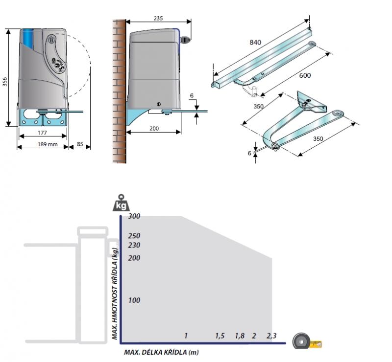 Elektromechanický pohon 24 V dc pro rotační brány s velikostí křídel do 2,3 m SLAVE – „podřízený“ pohon – včetně řídící jednotky