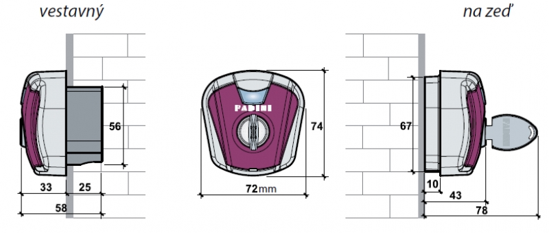 kompletní řada příslušenství k upevnění: boční držák, sloupky různé výšky (0,50 – 0,75 – 1,20 m), adaptér pro zmenšení otvoru a ochranná krabice ABS pro montáždo zdiva.