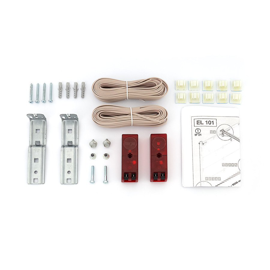 Jednocestný fotoelektrický senzor Hörmann EL 101 pro pohony garážových vrat ProMatic a SupraMatic řady 2, 3 a 4 v červené bezpečnostní barvě, aby se předešlo nehodám při manipulaci s pohony dveří. Skládá se z vysílače a přijímače. Obě čidla spolu neustále komunikují. Pokud je komunikační proud během pohybu brány narušen hrajícím si dítětem, jiným autem nebo jinou pohybující se překážkou, světelná závora odešle tuto informaci pohonu. Pohon okamžitě reaguje a zastaví pohyb brány.