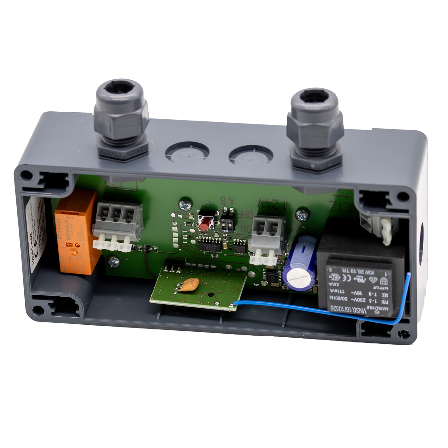1-kanálový reléový přijímač k obsluze přídavného venkovního osvětlení nebo garážových vrat dálkovým příslušenstvím Hörmann, kompatibilní s Hörmann homee, funkce zapnuto / vypnuto, impuls, nastavovací 3 min. světlo, nastavitelný, IP 65.