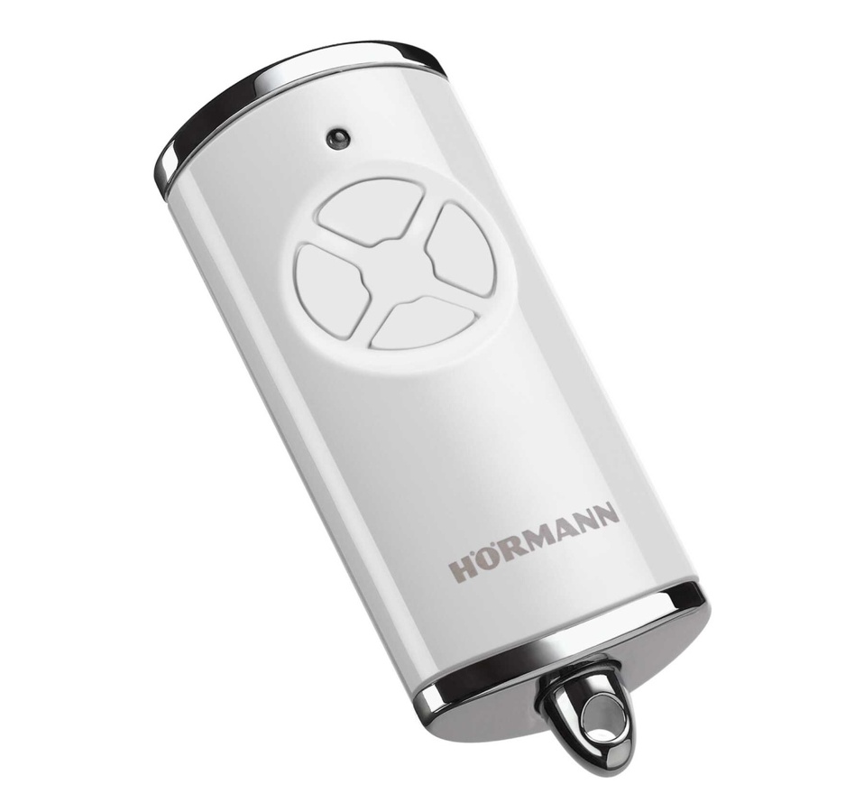 Ruční vysílač Hörmann HSE 4 868 MHz BiSecur (HSE4-868-BS) v barvě lesklá bílá, pouzdře s chromovanými krytkami, poutkem pro uchycení na klíčenku a v atraktivním designu. Je vhodný pro 868 MHz BiSecur přijímače a zpětně kompatibilní s 868 MHz přijímači s pevným kódem od firmy Hörmann, které se vyráběly do roku 2012. Nový model má matné provední oproti lesklému u starého.