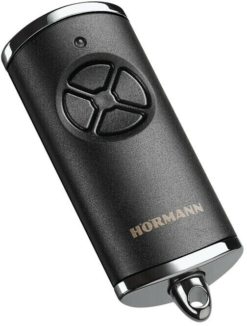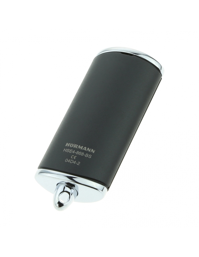 Ruční vysílač Hörmann HSE 4 868 MHz BiSecur (HSE4-868-BS) v černé barvě, pouzdře s chromovanými krytkami, poutkem pro uchycení na klíčenku a v atraktivním designu. Je vhodný pro 868 MHz BiSecur přijímače a zpětně kompatibilní s 868 MHz přijímači s pevným kódem od firmy Hörmann, které se vyráběly do roku 2012. Nový model má matné provední oproti lesklému u starého.