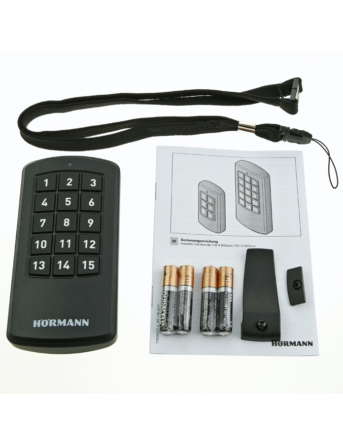 Průmyslový vysílač Hörmann HSI 15 868 MHz BiSecur (HSI15-868-BS) určený pro ovládání až 15 příjímačů. Je vhodný pro 868 MHz BiSecur přijímače a zpětně kompatibilní s 868 MHz přijímači s pevným kódem od firmy Hörmann, které se vyráběly do roku 2012. Součástí dodávky je spona na opasek a praktický ramenní popruh, takže ruční vysílač je vždy po ruce. Kromě toho je jako příslušenství k dispozici také ruční držák vysílače pro vysílač.