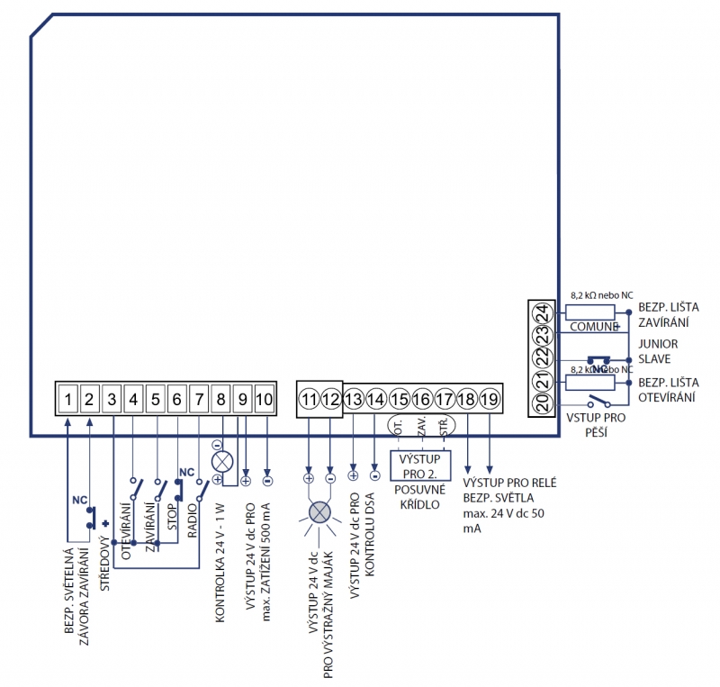 | Výstup fotobuněk/spínače/rádio. přijímače | 24 V dc max 500 mA | [V dc - mA] |