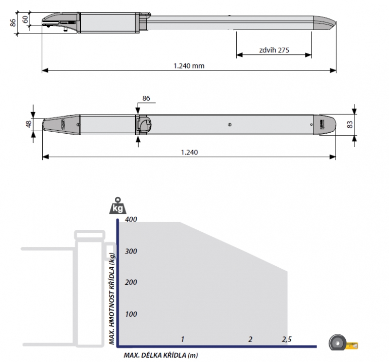 Hydraulický pohon pro rotační brány s maximální velikostí křídla 2,5 m, max. hmotnost křídla 400 Kg