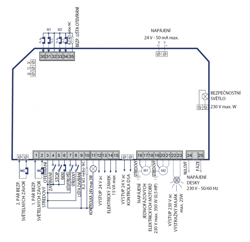 | Výstup fotobuněk/spínače/rádio. přijímače | 24 V ac | [V dc - mA] |