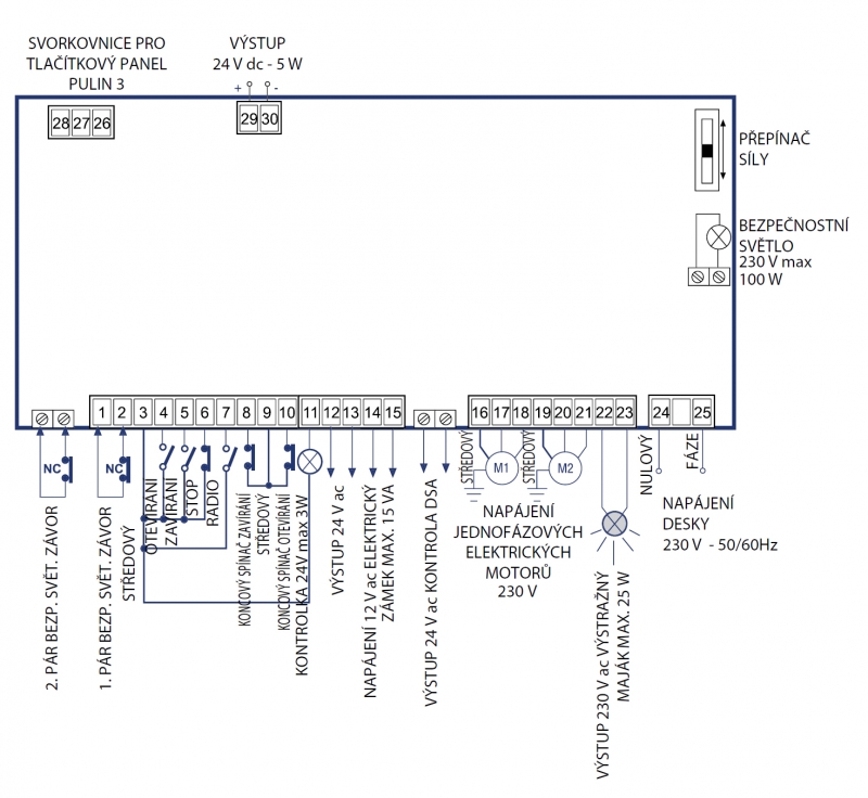 Univerzální řídící jednotka pro rotační i posuvné brány a garážová vrata, jednofázová