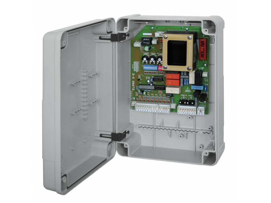 Univerzální řídící jednotka pro rotační i posuvné brány a garážová vrata, jednofázová. Automatický a poloautomatický provoz, signalizace poruch – LED diody, provoz mrtvý muž, krok za krokem, pěší mód, výstup elektrického zámku, zásuvná karta rádiového vysílače, vývody spojení s příslušenstvím – světelnými závorami, klíčovým spínačem otevřít – stop – zavřít a elektronickou kontrolou kroutícího momentu. Vhodné pro elektromechanické pohony.