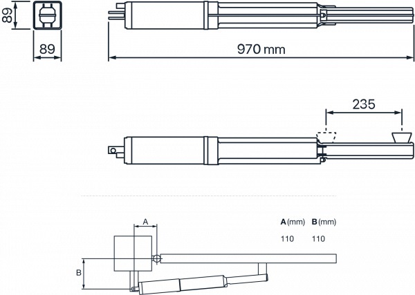 Hydraulický pohon pro rotační brány s maximální velikostí křídla 2,3 m. Pro rezidenční použití a použití v bytových domech.