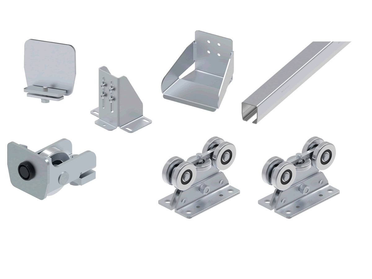 Sada komponentů pro posuvnou samonosnou bránu. Vodicí profil zinkovaný.