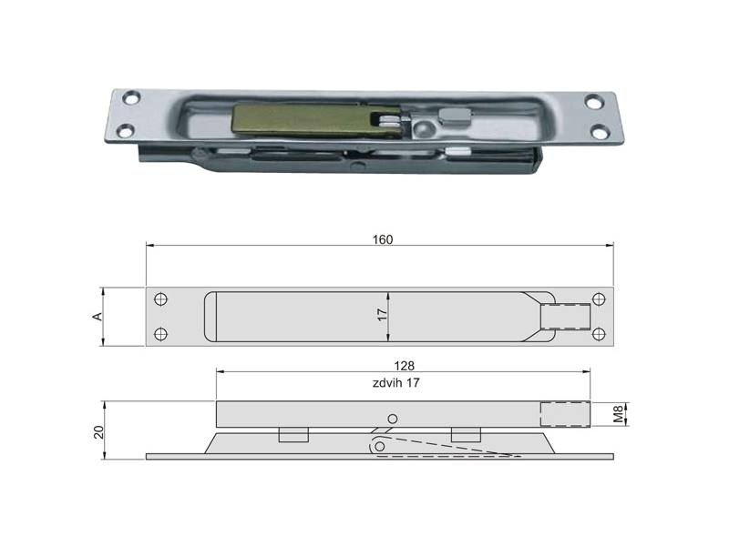 Zapuštěná zástrčka dveřního křídla, šířka 20,těž.proved. Zn 134 Kč